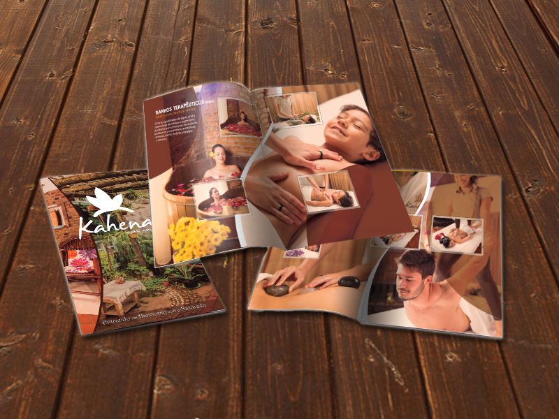 Design gráfico e diagramação para catálogo de serviços realizados pela empresa Kahena Espaço Natural.