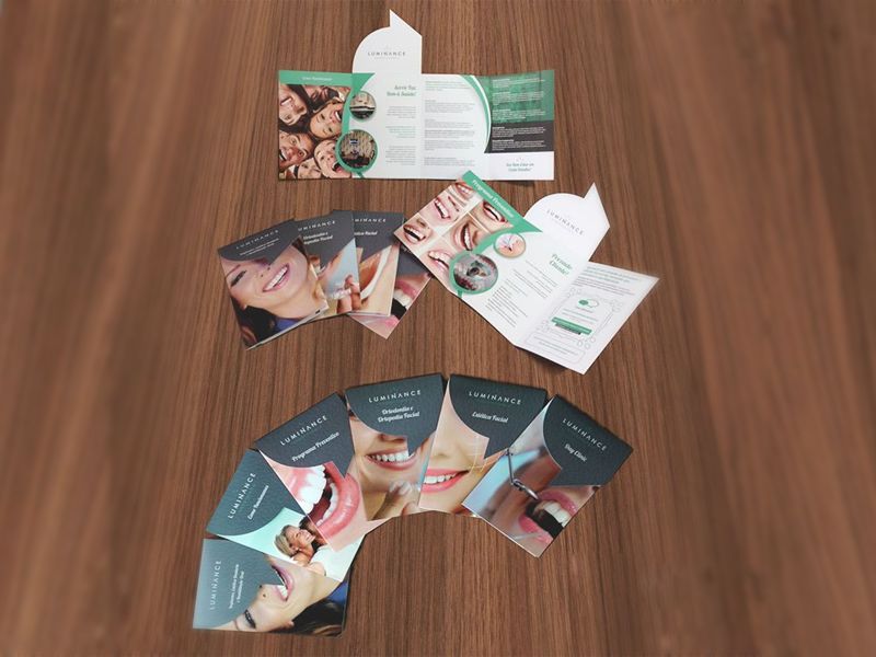 Design gráfico de 6 folders com 4 dobras, faca especial e verniz localizado para Luminance Odontologia.