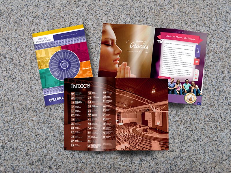 Design gráfico e diagramação de livreto contendo informações sobre a Paróquia São Cristóvão, juntamente com caderno de oraçoes e missas.